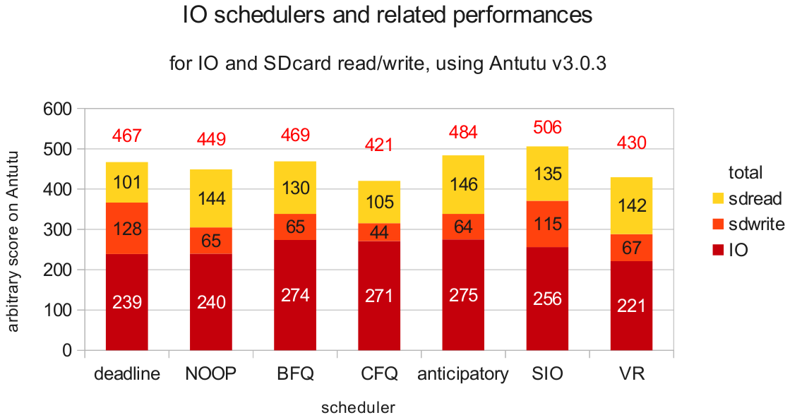 Here the highest SDcard write is provided by Deadline, but Database I/O (IO in the chart) is important for a good and responsive system...